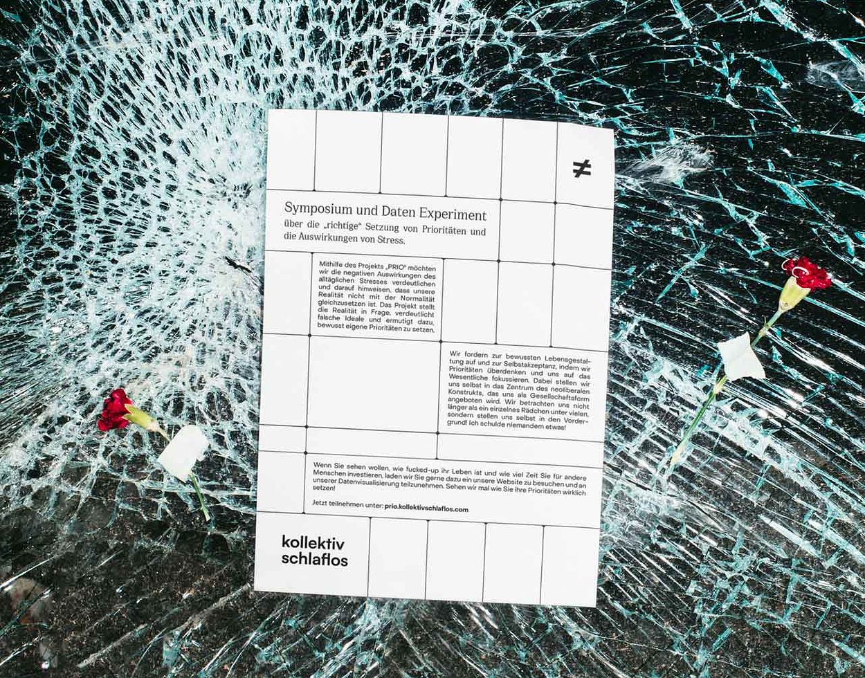 Mithilfe des Projekts „PRIO“ möchten wir die negativen Auswirkungen des alltäglichen Stresses verdeutlichen, um darauf hinzuweisen, dass Realität nicht mit Normalität gleichzusetzen ist. Das Projekt stellt die Realität in Frage, verdeutlicht falsche Ideale und ermutigt dazu, bewusst Prioritäten zu setzen. Ist es Dir das alles wert? Hat es sich gelohnt? Das sind Fragen, die sich Betrachter*innen stellen sollen, wenn sie sich mit dem Projekt auseinandersetzen. Wir fordern zur bewussten Lebensgestaltung auf, indem wir Prioritäten überdenken und uns auf das Wesentliche fokussieren. Dabei stellen wir uns selbst ins Zentrum des neoliberalen Konstrukts, das uns als Gesellschaftsform angeboten wird.