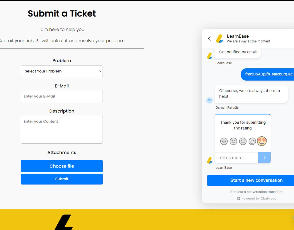 LearnEase includes live chat functionality on the main page and the support page, providing real-time assistance from support agents. This feature ensures that users can quickly resolve any issues or get answers to their questions, enhancing the overall user experience.