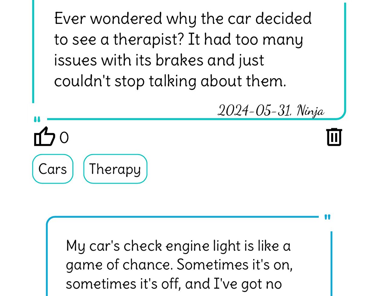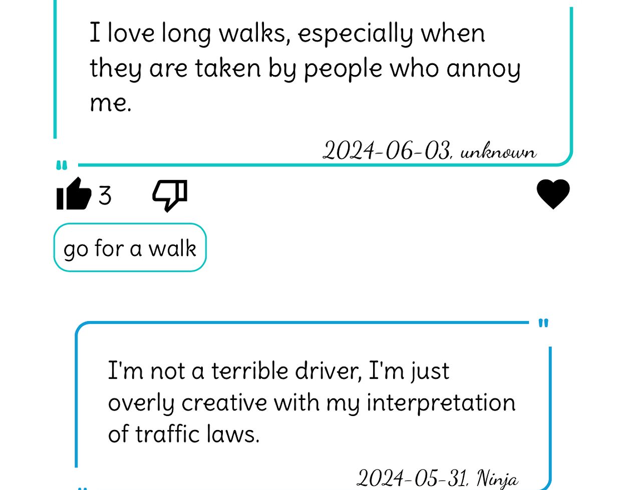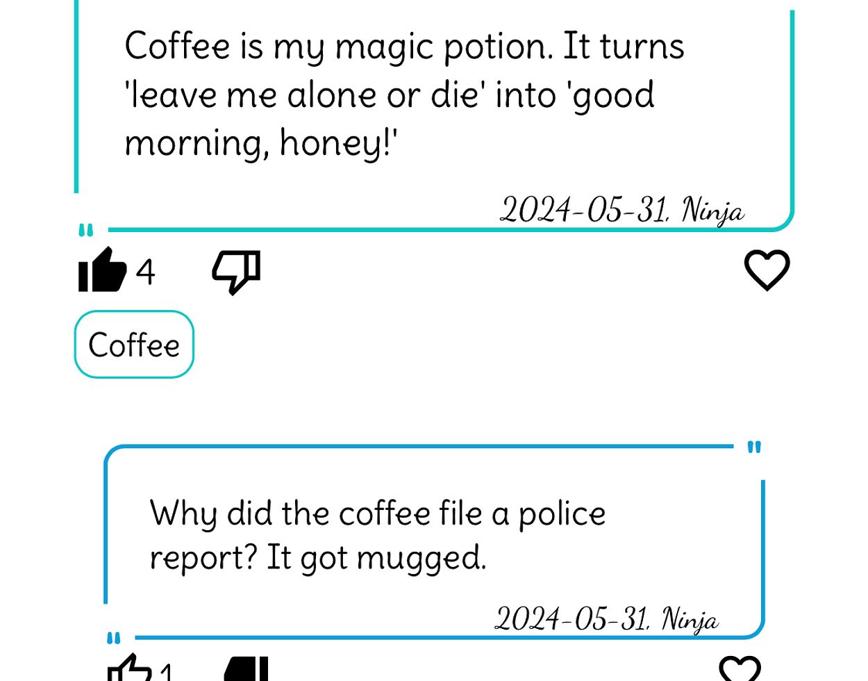So give it a try, it's worth the effort! On the one hand, you can filter the stored posts by topic and display the jokes of your choice. These can be liked, disliked or added to your favourites so that you can call them up again at any time. On the other hand, you can of course also create your own posts, display them separately at any time and delete them again if necessary.