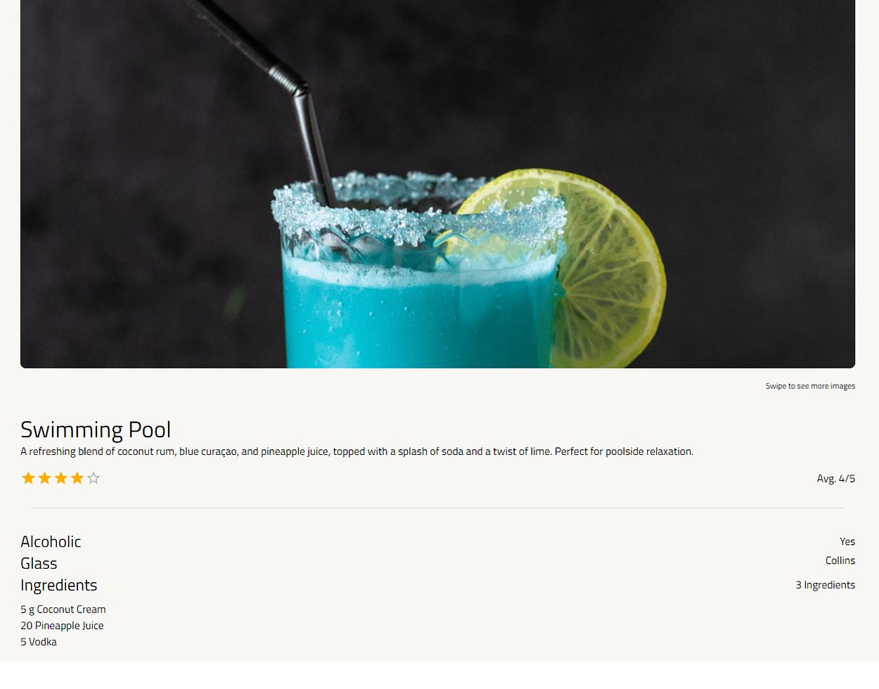 The project was an excellent opportunity to expand my technical skills and develop a practical application. The combination of React and Java Spring Boot proved to be highly effective for creating a dynamic and powerful cocktail website. With its user-friendly interface and extensive search and filter options, the platform offers significant value for all cocktail lovers.