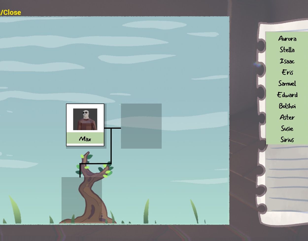 Family Tree Reconstruction: After each memory, players enter a UI overlay where they piece together Max’s family tree. Only the characters discovered in past memories are available. Players must correctly match names and relationships, relying on clues gathered.