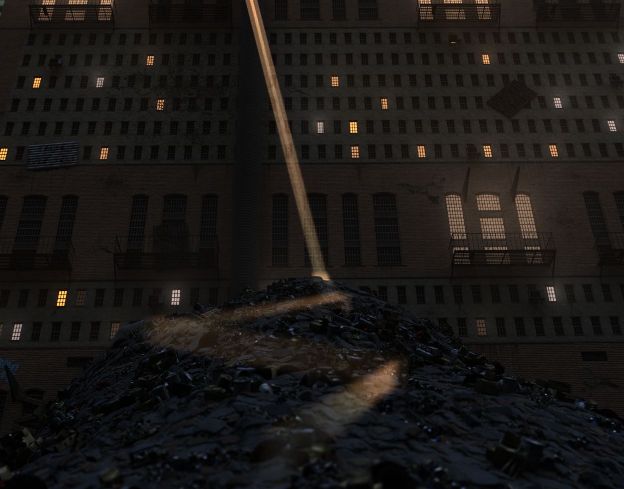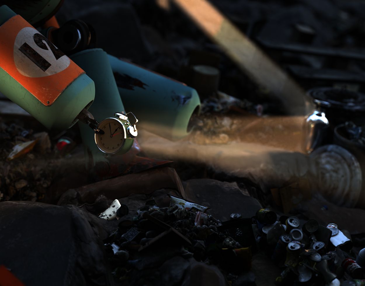 He stumbles down the garbage slope and discovers another robot just like him, lifeless and half-buried. With everything he has, he tries to bounce the sunlight toward his friend using scraps of reflective metal.