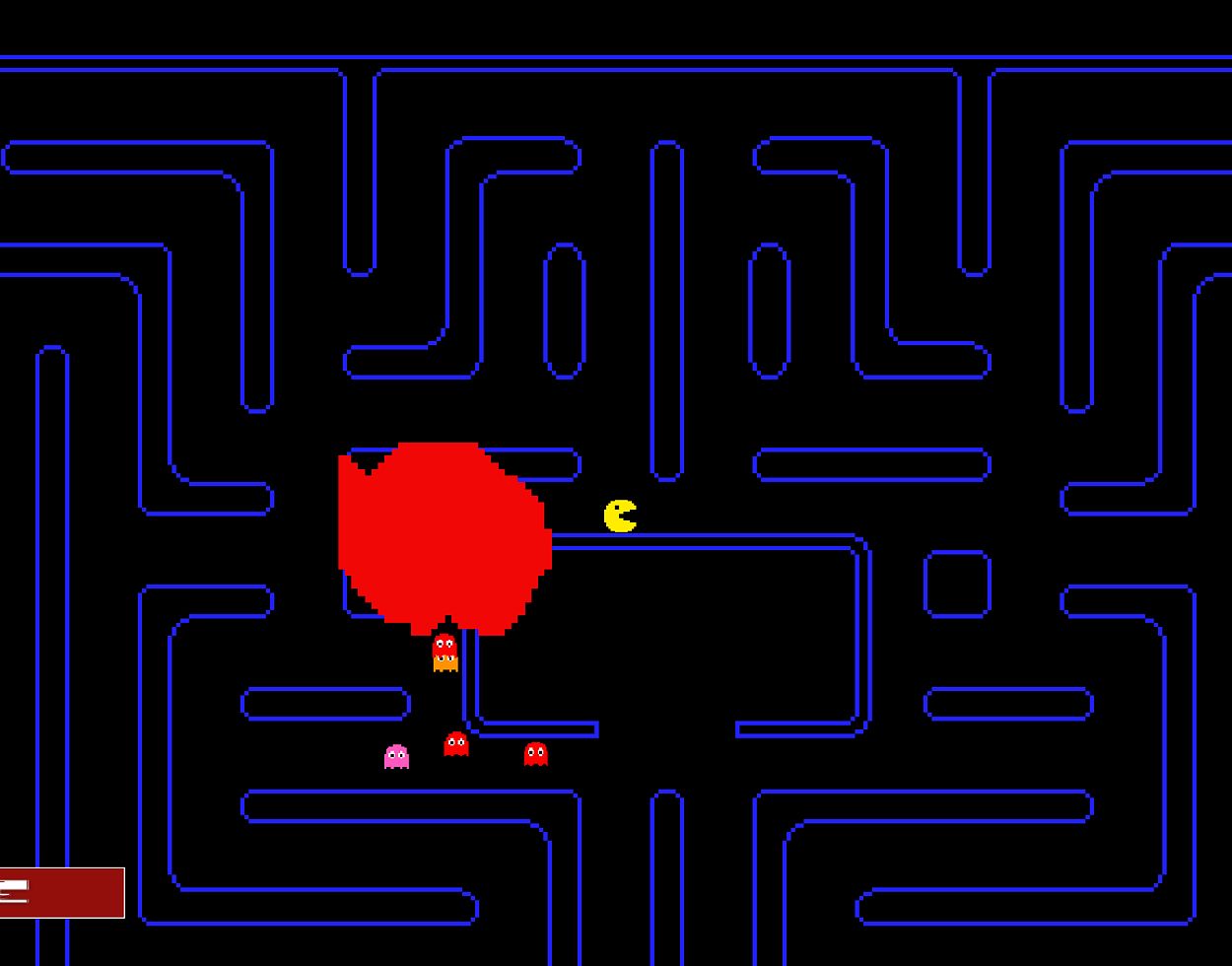 You control Pac-Man through a maze, avoiding or bombing ghosts. Bombs explode in a fixed radius that damages both ghosts and the player, and walls do not protect against the blast. Use caution when placing bombs to avoid self-inflicted damage.