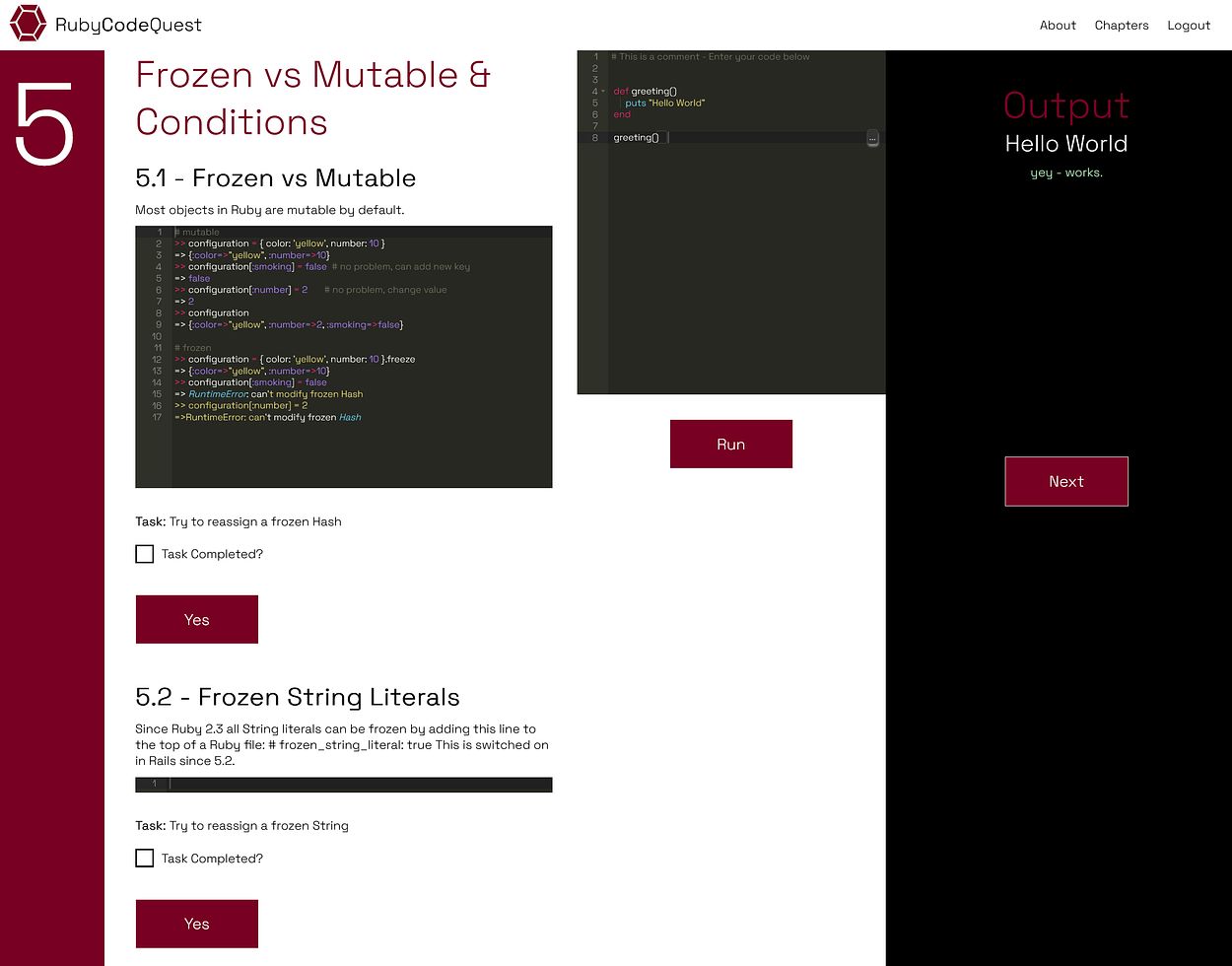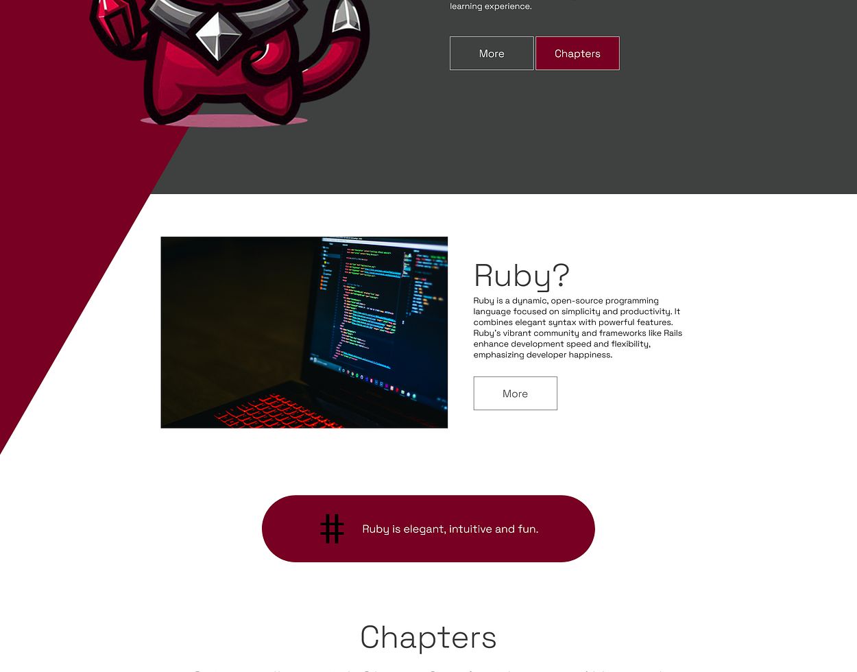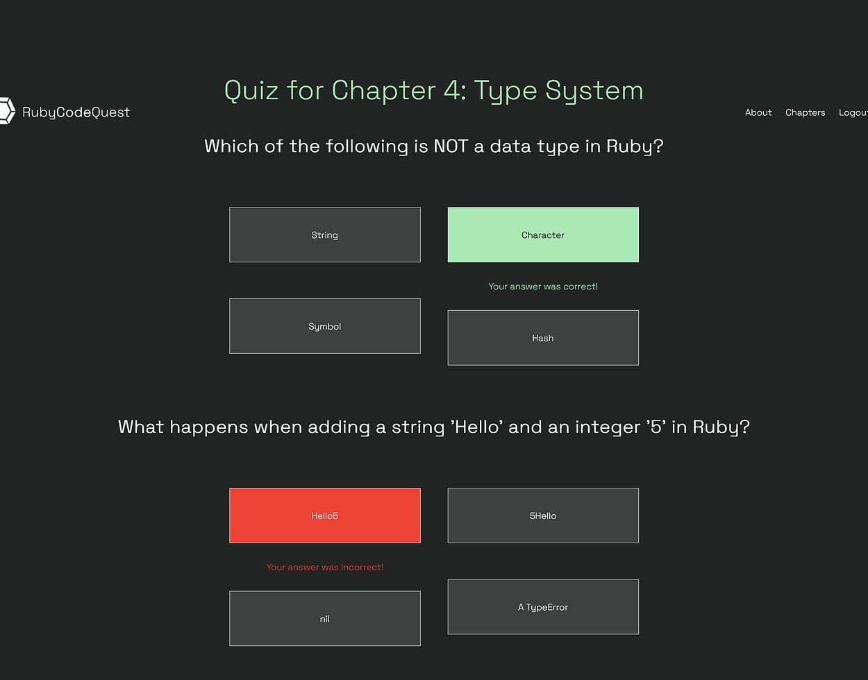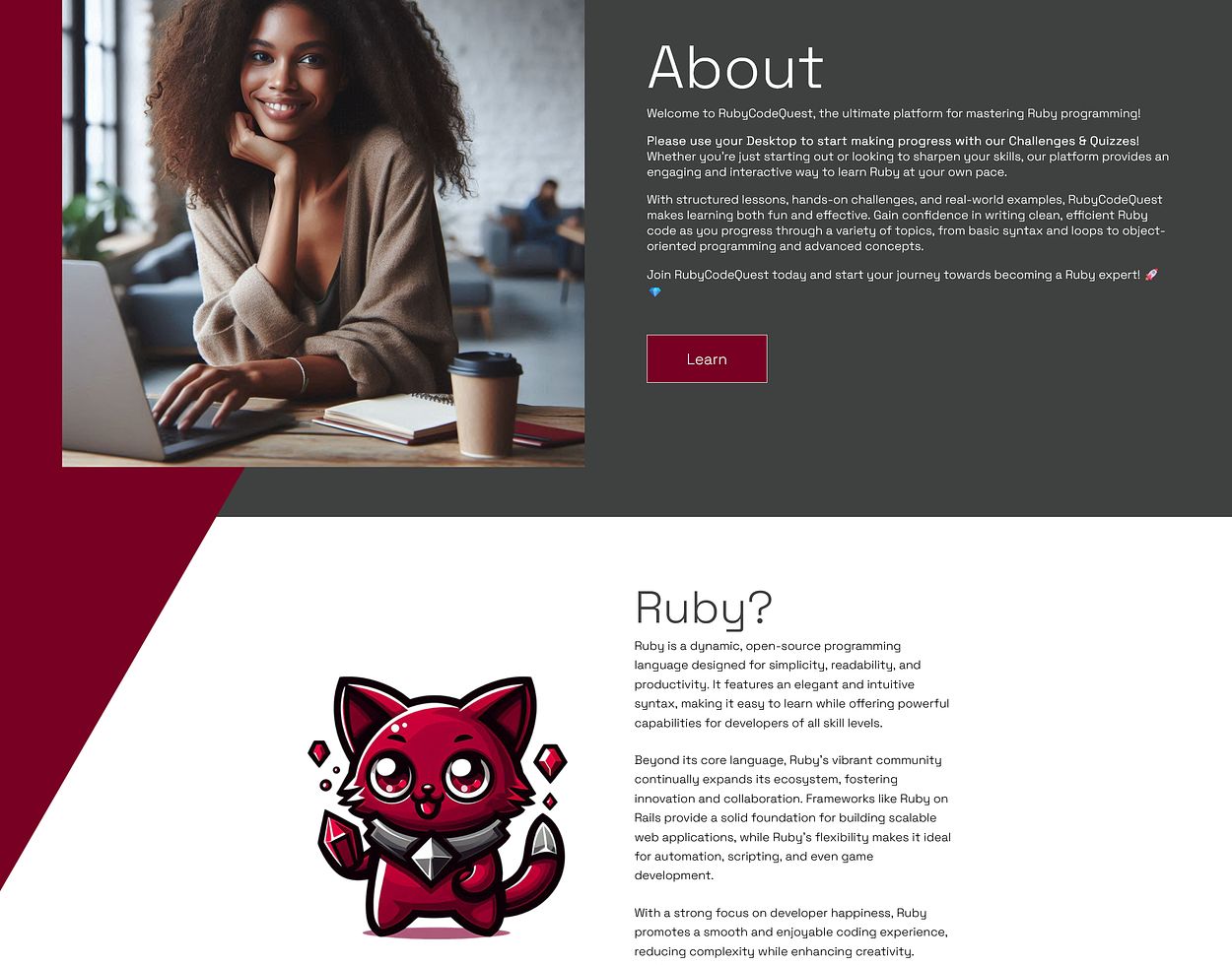 Embark on an exciting journey to learn Ruby programming with RubyCodeQuest! Whether you're a beginner or looking to sharpen your skills, our interactive platform makes coding fun and engaging. Write and execute Ruby code in our built-in Code Editor, challenge yourself with Quizzes, and track your progress as you advance. Meet Rudy, our friendly mascot, who will guide you every step of the way! Start coding, solve challenges, and become a Ruby pro—all from your laptop. Are you ready for the adventure? Let’s dive into the world of Ruby together! 🚀🔥